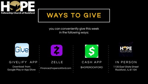 Mail a check, made out to Hope Fellowship Church of Rockford 1135 E State St. Rockford, IL, 61104