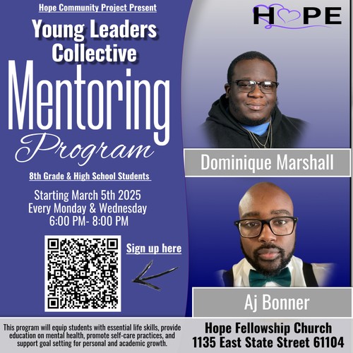 This community project initiative is dedicated to serving individuals of all ages—from the youngest children to the oldest adults. Our mission is to help restore hope in the city of Rockford by offering mentorship, guidance, and hands-on support. Through collaboration and collective effort, we aim to inspire and empower our community to reach its fullest potential.